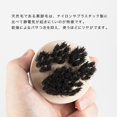ブラシ部分には100%黒豚毛を使用しています。ナイロンやプラスチック製に比べて静電気が起きにくく、乾燥によるパサつきを抑えながら、使うほどに自然なツヤを引き出します。適度なコシとやわらかさがあり、皮膚に負担をかけにくい設計です。