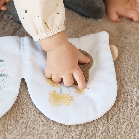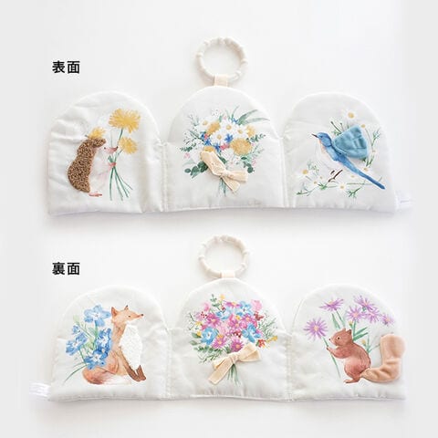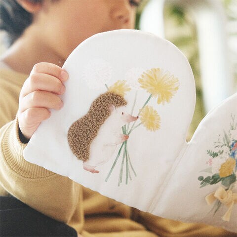 可愛らしい動物たちが花束を届けるデザインの布絵本です。