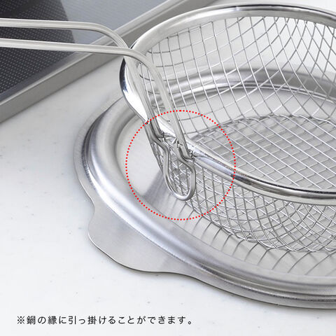 フック付きだから、揚げたあとは鍋の縁に引っ掛けてそのまま油切り。