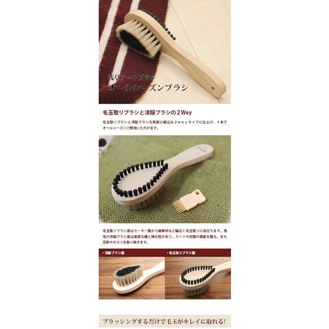 かんたん毛玉取りブラシに、カシミヤ用馬毛洋服ブラシを合体させたブラシです。春夏秋冬と四季を通じてご使用頂けます。