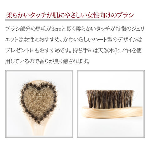 馬毛ボディブラシ・ハート「ジュリエット」。柔らかいタッチが肌にやさしい女性向けのブラシ。ブラシ部分の馬毛が3cmと長く柔らかいタッチが特徴のジュリエットは女性におすすめ。かわいらしいハート型のデザインはプレゼントにもおすすめです。持ち手には天然木(ヒノキ)を使用しているので香りが良く癒されます。お手入れに便利なブラシクリーナー付き。