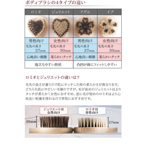 毛先の長さが違うので肌にタッチした時の柔らかさが異なります。どちらも肌にやさしい毛触りですが、毛が長めのジュリエットはよりタッチが柔らかく女性におすすめ、逆に毛が短めのロミオはより心地よい刺激を得られるので男性用におすすめです。