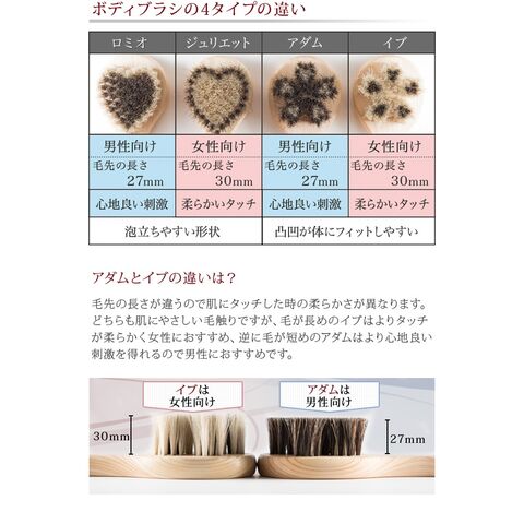 馬毛ボディブラシ・さくら「アダム」。心地よい刺激で男性におすすめ。ブラシ部分の馬毛が女性向けのイブより3mm短いアダムはブラッシングした際の刺激が心地よく、男性におすすめ。桜の花びらの一枚一枚が微妙に自由に動くため、凹凸のある体のどの部分にもフィットして心地よい刺激と爽やかさを感じます。持ち手は天然木(ヒノキ)なので香りが良く癒されます。お手入れに便利なブラシクリーナー付き。