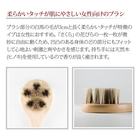 馬毛ボディブラシ・さくら「イブ」。柔らかいタッチが肌にやさしい女性向けのブラシ。ブラシ部分の馬毛が3cmと長く柔らかいタッチが特徴のイブは女性におすすめ。「さくら」の花びらの一枚一枚が微妙に自由に動くため、凹凸のある体のどの部分にもフィットして心地よい刺激と爽やかさを感じます。持ち手には天然木(ヒノキ)を使用しているので香りが良く癒されます。お手入れに便利なブラシクリーナー付き。