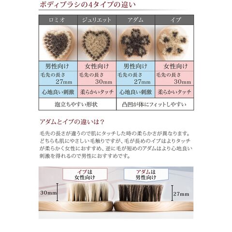 アダムとイブの違いは…毛先の長さが違うので肌にタッチした時の柔らかさが異なります。どちらも肌にやさしい毛触りですが、毛が長めのイブはよりタッチが柔らかく女性におすすめ、逆に毛が短めのアダムはより心地よい刺激を得られるので男性用におすすめです。
