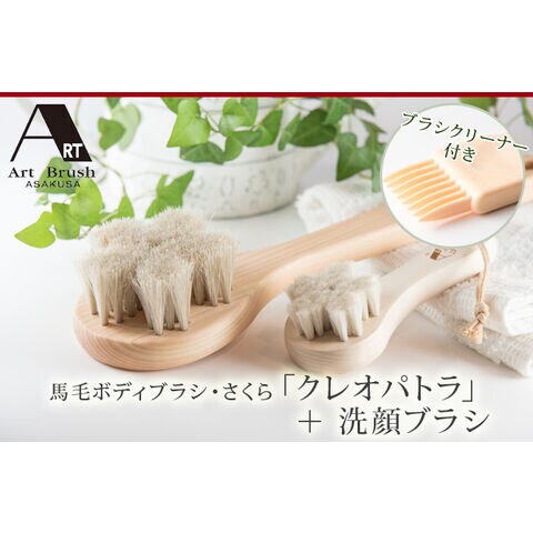 馬毛ボディブラシ・さくら「クレオパトラ」+と洗顔ブラシのセット。ボディブラシ「クレオパトラ」は「さくら」の持ち手を長くしたロングタイプです。泡立ち抜群の洗顔ブラシをセットにしてお得な価格でご提供いたします。お手入れに便利なブラシクリーナー付き。ブラシ職人が造る白馬毛を使用した高品質のブラシ。