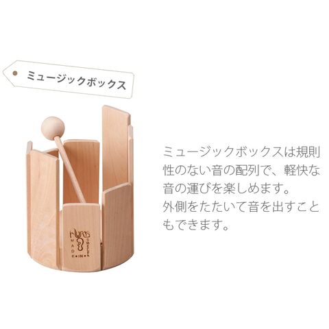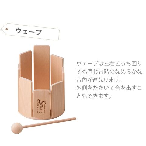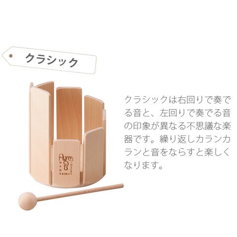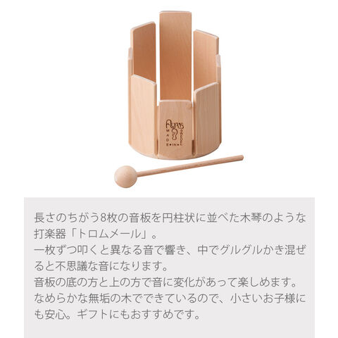 長さのちがう8枚の音板を円柱状に並べた木琴のような打楽器「トロムメール」。一枚ずつ叩くと異なる音で響き、中でグルグルかき混ぜると不思議な音になります。音板の底の方と上の方で音に変化あって楽しめます。なめらかな無垢の木でできているので、小さいお子様にも安心。ギフトにもおすすめです。