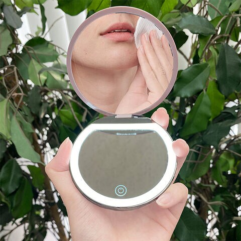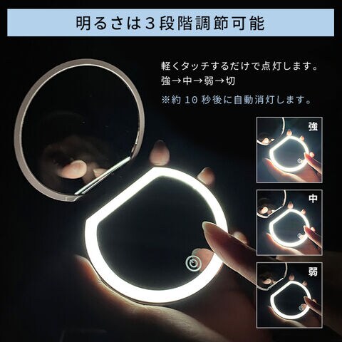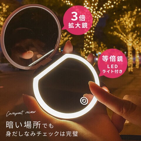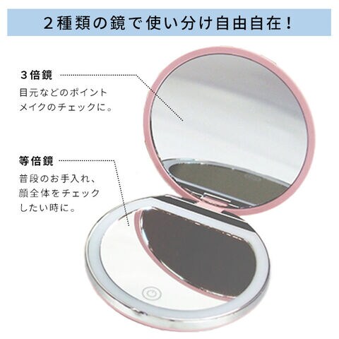 LEDライト付 コンパクトミラー(拡大鏡 ライト付き 鏡 ミラー 持ち運び コンパクト 折りたたみ 拡大 3倍 充電 メイク)