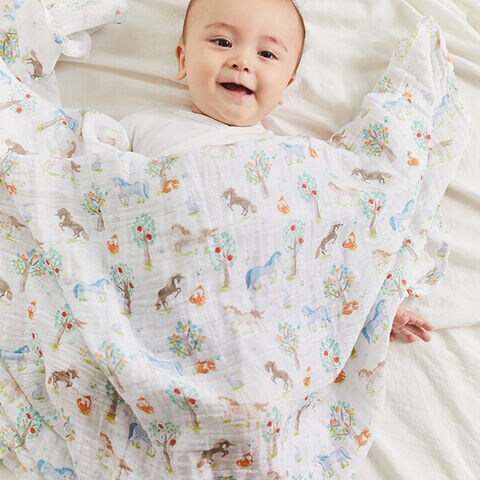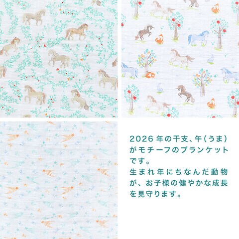 跳ねる馬や優しいタッチのイラストは、ベビーの誕生を祝うような明るい雰囲気で、おくるみタイムや写真撮影でもかわいく映えます。男女問わず使いやすいデザインで、初めての赤ちゃんにも安心して選べます。出産祝いにおすすめです。