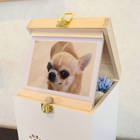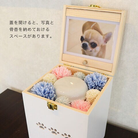 蓋の内側にはL判の写真が入るフォトフレームを配置。骨壺は手元供養のサイズ(4寸程度)までの大きさであれば収まります。遊んでいたおもちゃ、お気に入り服など入れても素敵です。