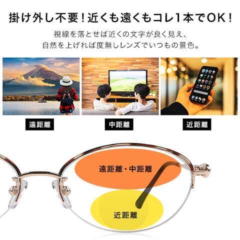 遠距離・中距離・近距離すべてよく見える遠近両用なので、シーン別に掛け外しの必要がありません。視線を落とせば近くのものが良く見える老眼レンズになっているので、スマホや新聞の文字が良く見えます。読書やデスクワークでもお使いいただけます。視線を上げれば度無しレンズで周りはいつもの景色。テレビを見る時、遠くの景色を見る時にでも外さなくてもよく見えます。