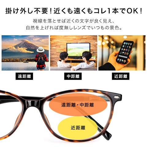 遠距離・中距離・近距離すべてよく見える遠近両用なので、シーン別に掛け外しの必要がありません。視線を落とせば近くのものが良く見える老眼レンズになっているので、スマホや新聞の文字が良く見えます。読書やデスクワークでもお使いいただけます。視線を上げれば度無しレンズで周りはいつもの景色。テレビを見る時、遠くの景色を見る時にでも外さなくてもよく見えます。