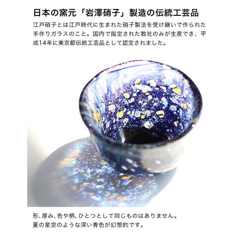 日本の窯元「岩澤硝子」製造の伝統工芸品。江戸時代に生まれたガラス製法を受け継いで作られたガラスで、国内で指定された数社のみが生産でき、平成14年に東京伝統工芸品として認定されました。