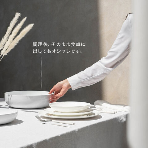 料理して、そのまま食卓に出すことができるキャセロールと着脱可能なクルップ式のハンドルです。浅めの鍋、または深めのフライパン、両方の使い方ができるサイズ感です。火を使った料理はもちろん、サラダを入れるボウルとしてなど、食器としても幅広くお使いいただけます。
