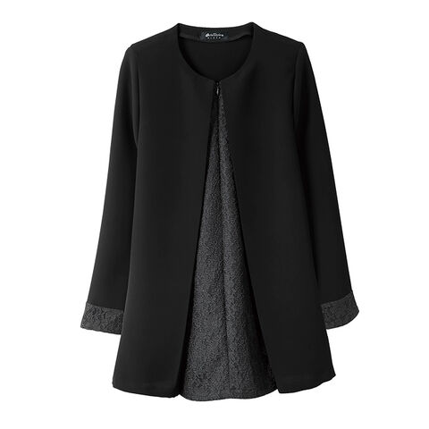 お尻まですっぽり覆い、程よく体形をカバーしつつ、肩パット付きなので、きちんと感のあるシルエットを作り出します。