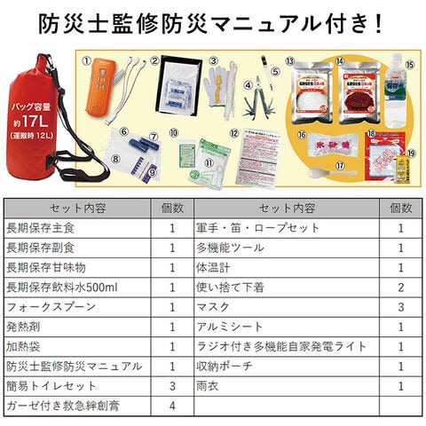 【内容物】長期保存主食×1 長期保存副食×1 長期保存甘味物×1 長期保存飲料水500ml×1 フォークスプーン×1 発熱剤×1 加熱袋×1 防災士監修防災マニュアル×1 簡易トイレセット×3 ガーゼ付き救急絆創膏×4 軍手・笛・ロープセット×1 多機能ツール×1 体温計×1 使い捨て下着×2 マスク×3 アルミシート×1 ラジオ付き多機能自家発電ライト×1 収納ポーチ×1 雨衣×1