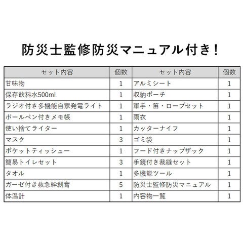 【内容物】甘味物×1 保存飲料水500ml×1 ラジオ付き多機能自家発電ライト×1 ボールペン付きメモ帳×1 使い捨てライター×1 マスク×3 ポケットティッシュー×1 簡易トイレセット×3 タオル×1 ガーゼ付き救急絆創膏×5 体温計×1 アルミシート×1 収納ポーチ×1 軍手・笛・ロープセット×1 雨衣×1 カッターナイフ×1 ゴミ袋×1 フード付きナップザック×1 手鏡付き裁縫セット×1 多機能ツール×1 防災士監修防災マニュアル×1 内容物一覧×1