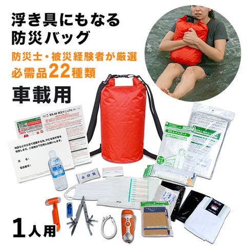 1-2W EX.ドライブ・セーフ・ホーム 浮かぶ防水バックパック付車載防災セット(防災バッグ 1人用 非常用持ち出し袋 リュック 置き場所 自宅 寝室 災害備蓄 セット リュックサック 地震 洪水 災害)
