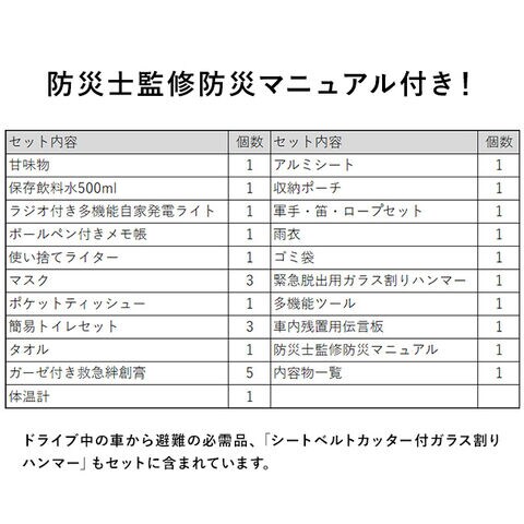 【内容物】甘味物×1 保存飲料水500ml×1 ラジオ付き多機能自家発電ライト×1 ボールペン付きメモ帳×1 使い捨てライター×1 マスク×3 ポケットティッシュー×1 簡易トイレセット×3 タオル×1 ガーゼ付き救急絆創膏×5 体温計×1 アルミシート×1 収納ポーチ×1 軍手・笛・ロープセット×1 雨衣×1 ゴミ袋×1 緊急脱出用ガラス割りハンマー×1 多機能ツール×1 車内残置用伝言板×1 防災士監修防災マニュアル×1 内容物一覧×1