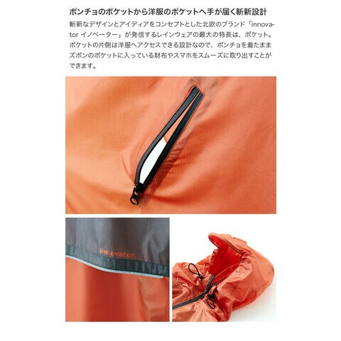 斬新なデザインとアイディアをコンセプトとした北欧のブランド「innovator イノベーター」が発信するレインウェアの最大の特長はポケット。ポケットの片側は洋服へアクセスできる設計なので、ポンチョを着たままズボンのポケットに入っている財布やスマホをスムーズに取り出すことができます。