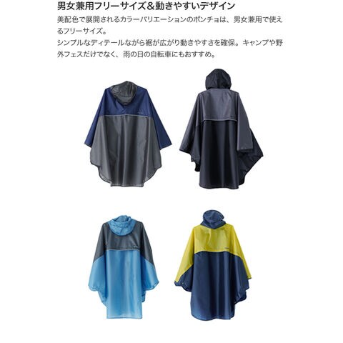 美配色で展開されるカラーバリエーションのポンチョは、男女兼用で使えるフリーサイズ。