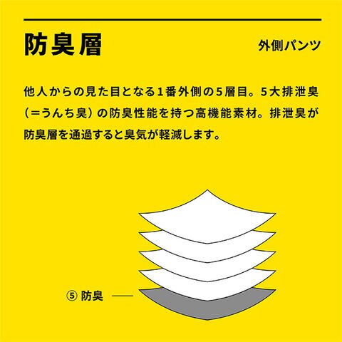 【素材】[拡散層]綿100% [吸水層]レーヨン100% [防水層]綿95%、ポリウレタン5%(裏面にPU透湿防水加工) [股下吸水部分]ポリエステル100% [防臭層]綿95%、ポリウレタン5% [ウエストゴム]ナイロン52%、ポリエステル38%、ポリウレタン10% [サイド]ポリエステル80%、ポリウレタン20%