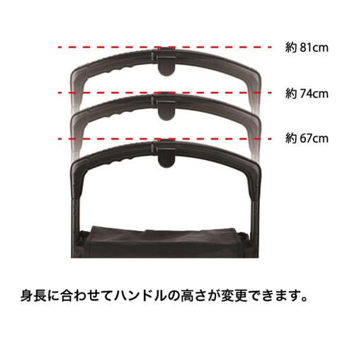 ハンドルは3段階で高さ調節ができ、約67cm~81cmまで対応。使用する方の身長やシーンに合わせてお使いいただけます。