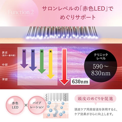 赤色LED・マイナスイオン・EMS・バイブレーションという4つの機能を搭載し、髪と頭皮の美しさをトータルでサポート。