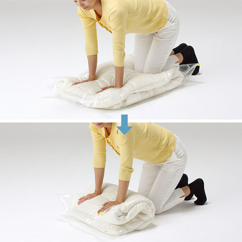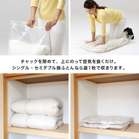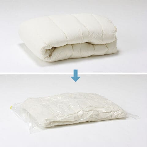 【備考】・圧縮保存期間は6ヶ月を目安にしてください。 ・ファスナーが弱くなるまで繰り返し使えます。 ・羽毛布団に使用する場合は、三分の一程度に圧縮してください。