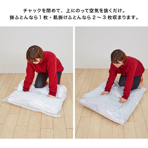 【備考】・圧縮保存期間は6ヶ月を目安にしてください。 ・ファスナーが弱くなるまで繰り返し使えます。 ・羽毛布団に使用する場合は三分の一程度に圧縮してください。