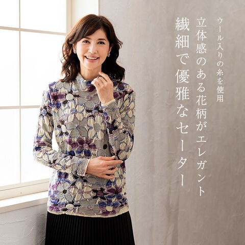 1-2W 【LLサイズ】 ウール入り花柄ジャカードセーター(トップス レディース 秋 きれいめ 長袖 ニット セーター ミセス ファッション) ※1枚目の画像は代表イメージのため色・柄が異なる場合がございます。2枚目以降で色・柄をご確認下さい。