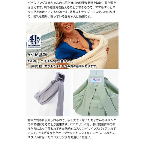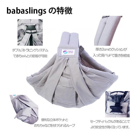 ババスリングは赤ちゃんのお尻と脊柱の健康な発達を助け、首と頭をささえます。 肩や抱き方を換えることができるので、ママもずっとスリングを着けていても快適です。 調整ストラップ・システムのおかげで、授乳も簡単、眠っている赤ちゃんは快適です。
