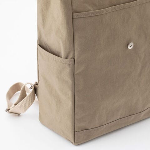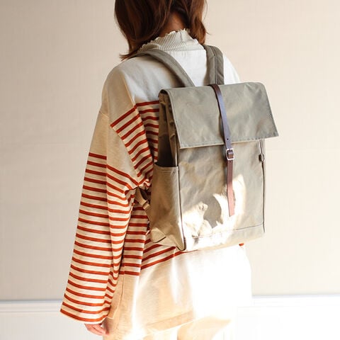 ふた部分に本革ベルトを使いアクセントをつけました。背面生地内側をウレタンで仕切り、中に入れた荷物が背中に直接当たるのを防いでいます。