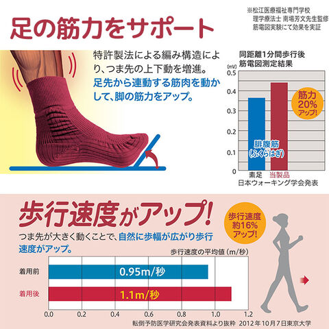 そのおかげで、つま先から連動して足元全体の筋肉がしっかりと動き、歩幅が広がり、歩行速度のアップにもつながります。