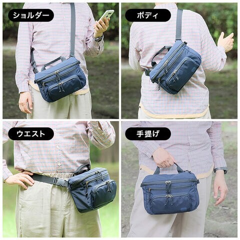 ショルダーストラップを調整してショルダーバッグ・ボディバッグに。バックル付きストラップでウエストバッグとしても使用でき、背面ポケットにストラップを収納すれば手提げバッグにも変身。