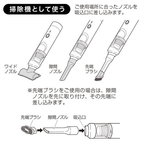 【仕様】[吸引量(未使用時)]4000Pa [ダストボックス容量]0.13L [出力]45W ±10% [定格電圧]7.4V [定格入力]5V 2A [駆動時間]約15~20分 [充電ポート]タイプC/DC [充電時間]3.5~4時間 [充電電圧範囲]5V [リチウムイオン電池]3.7V 1800mAh×2本 [LED表示]2種類(充電中・満充電)