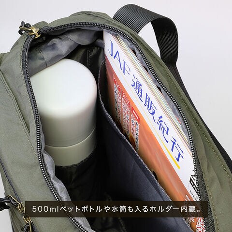 500mlのサーモボトルも収納できる専用ホルダーを内部に装備。バッグの中で倒れていたり、他の荷物を傷つける心配がありません。