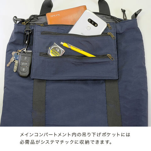 メイン収納部には吊り下げ式ポケット付き。財布やスマホ、カードケース、筆記具などを仕分けしながら収納できます。荷物の「底に沈んで見つからない」を防ぎ、必要な物がすぐ取り出せます。さらに、内側にキーフックを搭載しているので、鍵が埋もれずにサッと取り出せるため、玄関や車の前であわてません。