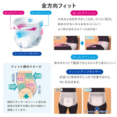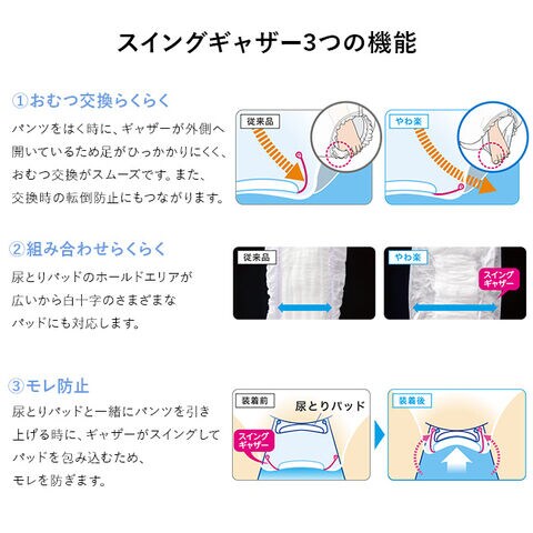 長めのフィットアップギャザーが隙間をつくらず、モレを防止。さらにスイングギャザーが尿とりパッドをしっかり固定します。