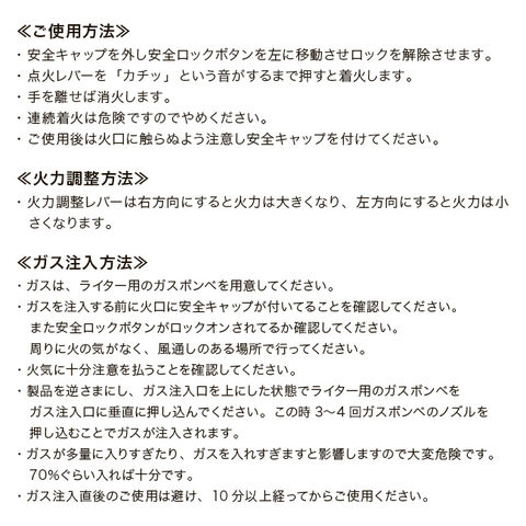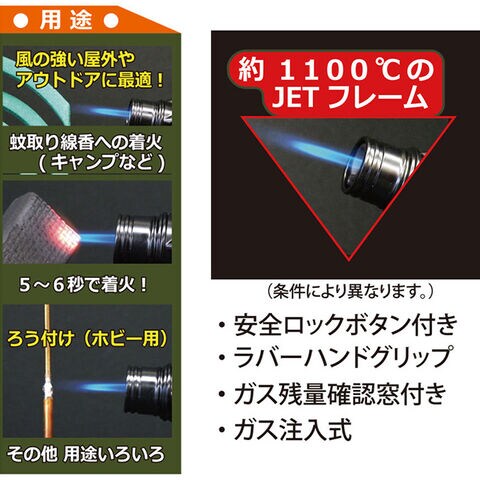 【仕様】・ガス注入式 ・安全ロック、安全キャップ付き ・ガス残量視認可 ・炎調節レバー