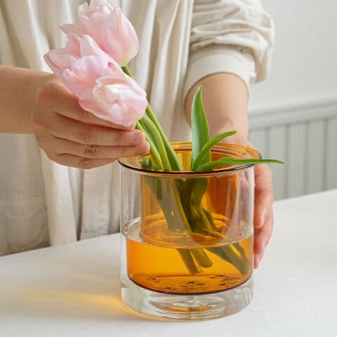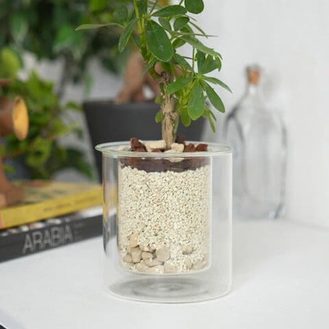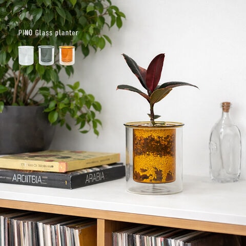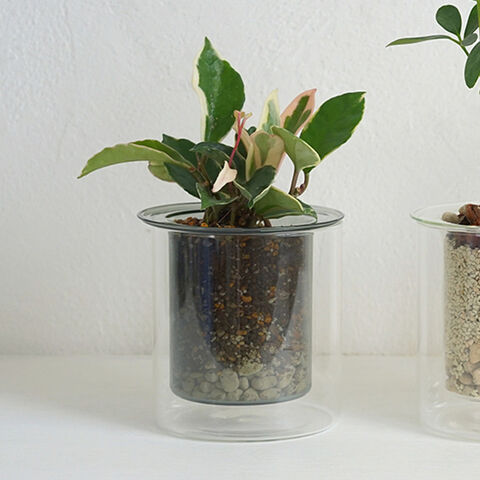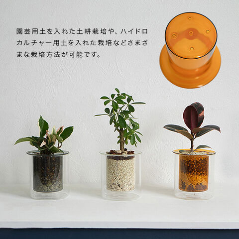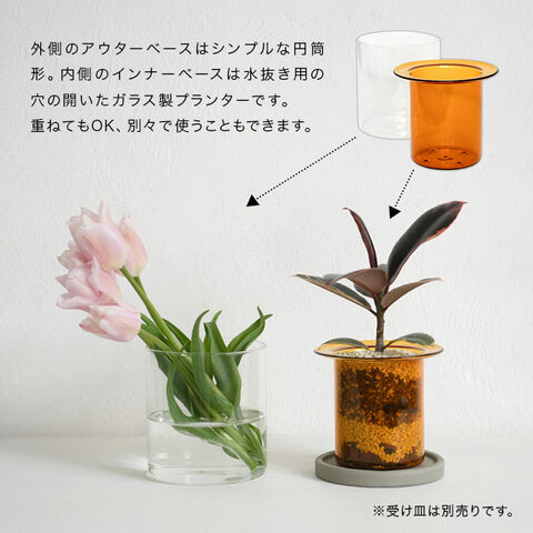 透明感のあるガラスとシンプルな円柱デザインが魅力のフラワーベース兼プランターです。クリアやスモークの質感がインテリアに自然に馴染み、デスクやテーブル、玄関など限られたスペースにも置きやすい3号サイズです。アウターポットとインナーポットの二重構造で、土耕栽培やハイドロカルチャーなど幅広い使い方に対応します。水抜き穴付きで管理しやすく、根や水分の状態も外から確認可能。