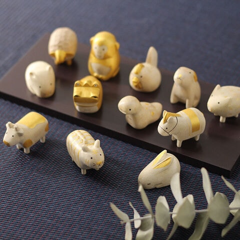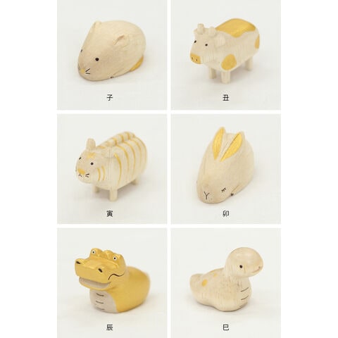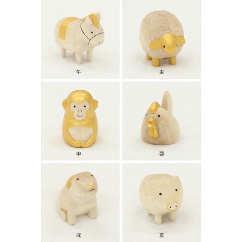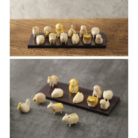 【サイズ(約)】ねずみ:3.5×2.5×H2.5cm うし:4.5×2×H3.5cm とら:4.5×2×H3.5cm うさぎ:4×2.3×H2.5cm たつ:4.5×2.5×H3.5cm へび:4.5×2.5×H3.5cm うま:4.5×2×H3.5cm ひつじ:3.5×2.5×H3cm さる:2.8×2.8×H3.5cm とり:4.5×2.3×H3.5cm いぬ:3.5×2.5×H3.5cm いのしし:4×2.8×H3cm 台座:24×10×1cm