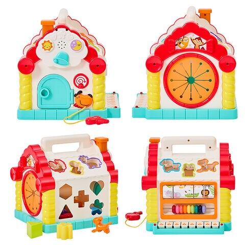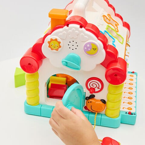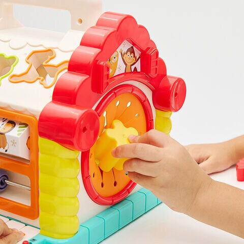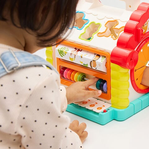 手先・目・耳を使った新しい発見がいっぱいのおうち型おもちゃ。