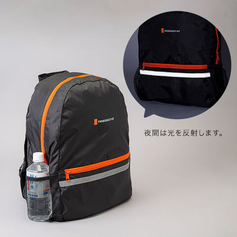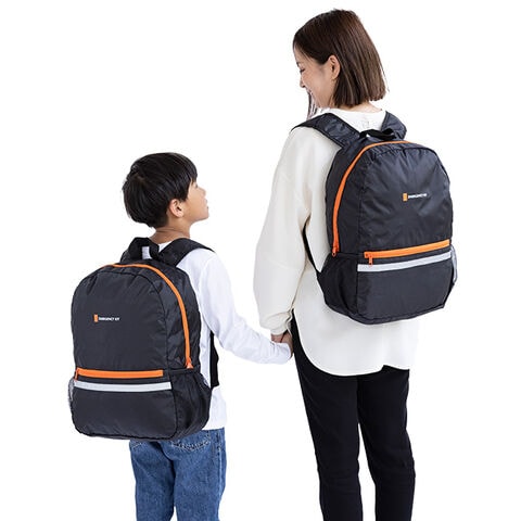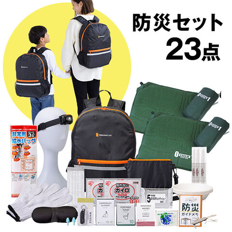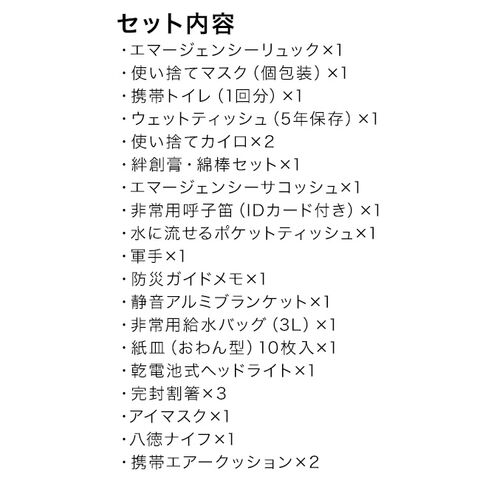 【セット内容】[1]エマージェンシーリュック×1 [2]エマージェンシーサコッシュ×1 [3]携帯エアークッション×2 [4]防災ガイドメモ×1 [5]軍手×1 [6]水に流せるポケットティッシュ×1 [7]ウェットティッシュ(5年保存)×1 [8]非常用給水バッグ(3L)×1 [9]紙皿(おわん型・10枚入)×1 [10]完封割箸×3 [11]携帯トイレ(1回分)×1 [12]使い捨てカイロ×2 [13]使い捨てマスク×1 [14]静音アルミブランケット×1 [15]非常用呼子笛(IDカード付き)×1 [16]絆創膏×2枚・綿棒×10本 [17]乾電池式ヘッドライト(IPX4防水・単4電池×3本※別売)×1 [18]八徳ナイフ×1 [19]アイマスク×1