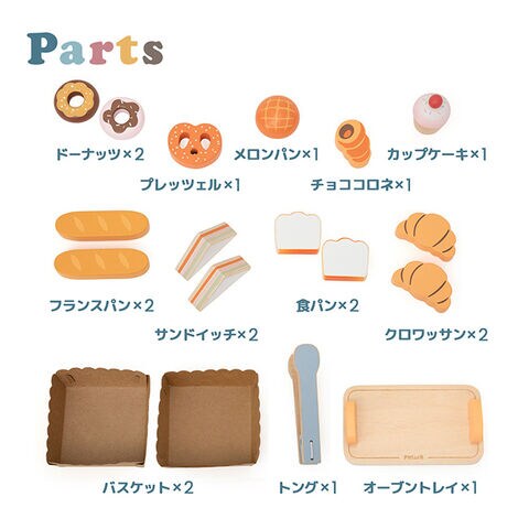 【内容物】ドーナッツ×2 プレッツェル×1 メロンパン×1 チョココロネ×1 カップケーキ×1 フランスパン×2 サンドイッチ×2 食パン×2 クロワッサン×2 バスケット×2 オーブントレイ×1 トング×1