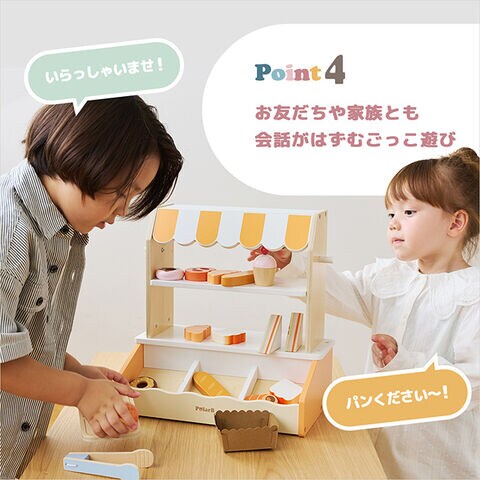 ●店員さんとお客さんになりきって会話したり、「これください」「はいどうぞ」などのやりとりが生まれ、コミュニケーションが広がります。
