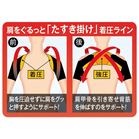 肩を前から押さえ、背中側で引き寄せる設計。