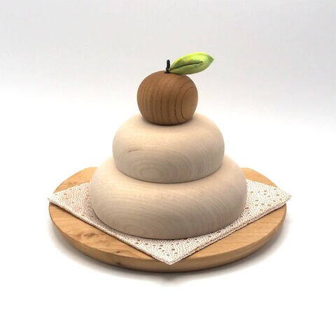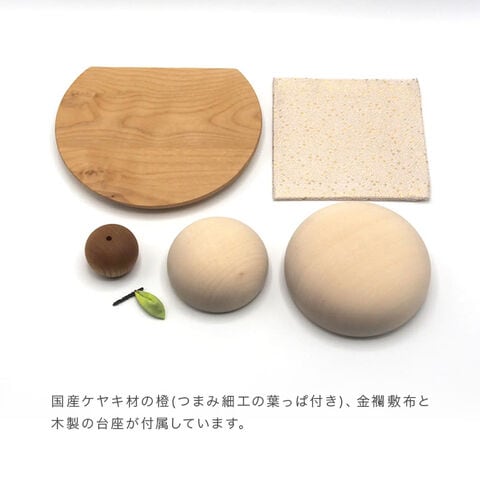 【素材】[お餅]メイプル無垢材(ソープフィニッシュ) [橙]国産ケヤキ無垢材(ウレタン仕上げ・底面滑り止め塗装) [葉]綿、針金 [台座]アルダー集成材(アルドボスオイル仕上げ)