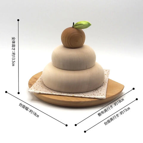【サイズ(約)】[下のお餅]直径11.5cm×高さ4cm [上のお餅]直径8cm×高さ3.5cm [橙]直径4.2cm×高さ3.2cm [台座]幅18cm×奥行15cm [敷布]縦13cm×横13cm [全体高さ]13.5cm(台座・葉含む)