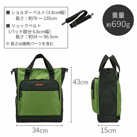 【仕様】[正面]ファスナーポケット、ファスナーアウトポケット [内部]オープンポケット×2、ファスナーポケット、ファスナーネットポケット、ペン差し [背面]オープンポケット、リュックベルト [両側面]ネットポケット [本体内部]オープンポケット [その他]ショルダーベルト、底板